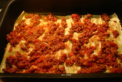The first step is making the ragu because it has to cook the longest. Prepare a mirepoix, called soffritto in Italian, by chopping up your carrot, celery (as you can see in the photo, I used a frozen stalk - a tip from my mother in law: she always keeps some clean celery and carrots in a freezer bag) and onion. I keep my vegetables pretty chunky. Pour some olive oil into a large pan or sauce pan and sauté the chopped vegetables. This is the base of many Italian dishes. When the soffritto has softened add in the ground meat and let brown. Sprinkle in salt and pepper and add the bay leaf (I used a salt and herb mix instead). Then add in the tomato sauce. I usually use the kind with pieces in it but any kind will do. At this point just let this simmer on low heat for as long as you can. The secret to a great ragù is letting it cook a long time.